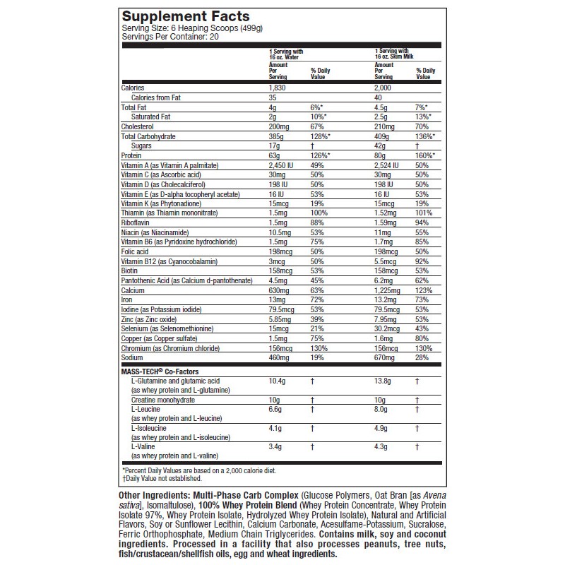 Présentation de produit : Mass-Tech Extreme 2000 est une formule de gainer ultra-complète et avancée, fabriquée par la marque MuscleTech. Cette formule très puissante, a été parfaitement dosée avec un ratio protéines/glucides idéal pour une prise de masse optimale. Ce produit est destiné aux personnes débutantes comme confirmées, souhaitant augmenter de façon rapide leur masse musculaire ou ayant des difficultés à prendre du poids. ?Mass-Tech Extreme 2000 est un gainer qui vous fournit une quantité importante dénergie sous forme de glucides et de protéines. Pour une demi dose (3 dosettes), nous avons un apport de 915 calories dont 31,5g de protéines à digestion rapide (concentré et isolat de whey protéine, protéine whey isolate et whey hydrolysée). Nous avons 192g de glucides dont 8,5g de sucres avec un complexe des meilleurs glucides à digestion rapide et lente (isomaltulose et son davoine). Mass-Tech contient uniquement des « bonnes graisses » riches en Omega 3, pour vous permettre dapporter des graisses saines à votre organisme. Nous avons aussi 5g de créatine monohydrate pour augmenter la force et les performances sur des efforts courts et intenses. Les 7g de BCAA, acides aminés ramifiés (Leucine, Isoleucine et Valine) sont dits essentiels puisqu'ils ne peuvent pas être synthétisés seul par l'organisme et doivent être apportés par l'alimentation et la supplémentation. Enfin, nous retrouvons 5,2g de L-Glutamine, l'acide aminé le plus abondant dans lorganisme et les muscles. Utilisation : Prendre 1 dose (6 cuillerées de mesure, soit 499g) avec environ 500ml deau fraîche ou de lait écrémé et consommer entre les repas ou immédiatement après lentraînement.