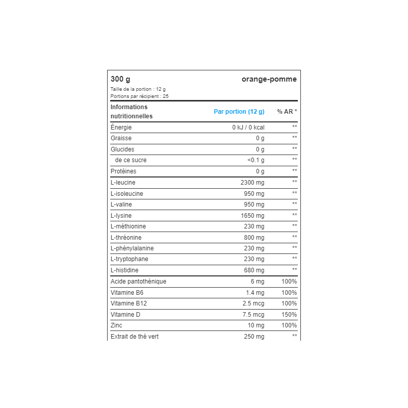 Nous retrouvons 8 g d'EAA par dose, de la vitamine B5, B6, B12, D, et du Zinc.