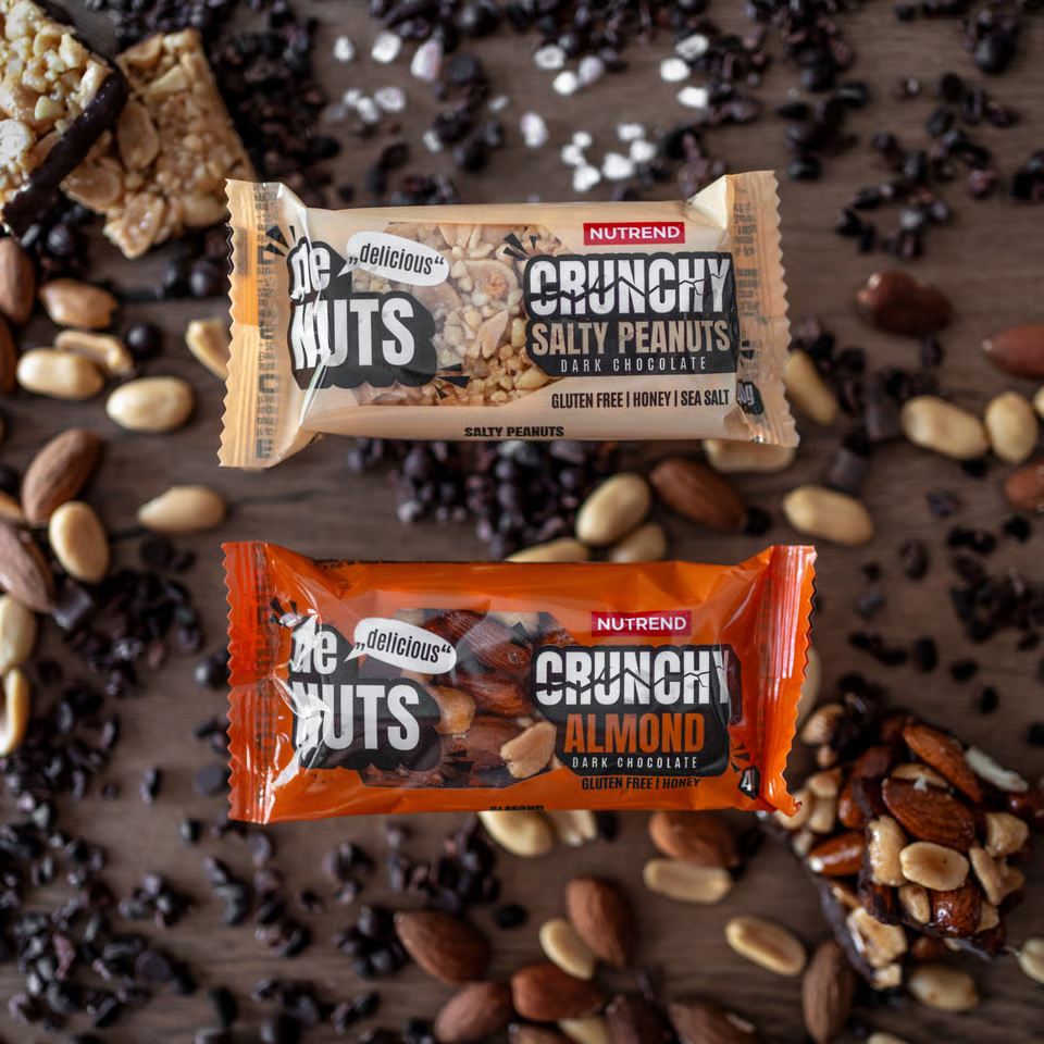Savourez le croquant irrésistible et la gourmandise intense avec les barres Denuts Crunchy. Deux déclinaisons pour satisfaire toutes vos envies : les arachides salées enrobées de chocolat noir, avec une touche subtile de sel marin qui sublime le goût des cacahuètes grillées, et les amandes enrobées de chocolat noir, riches et délicieusement fondantes, pour une pause saine et savoureuse.
