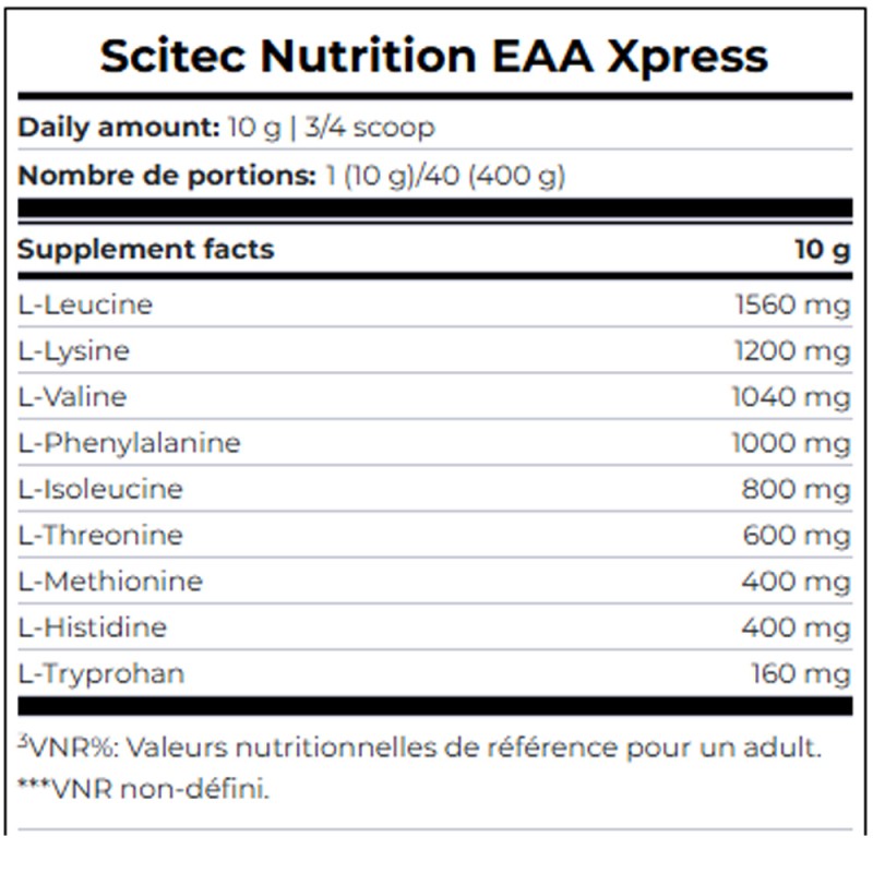 EAA Xpress offre est un mélange de 9 acides aminées essentiels (EAA), dont 3400 mg de BCAA et 7160 mg d'EAA par portion. Idéal pour les athlètes, ce complément sans gluten, sans sucre, et sans lactose aide à soutenir le développement musculaire et à maintenir un métabolisme équilibré.