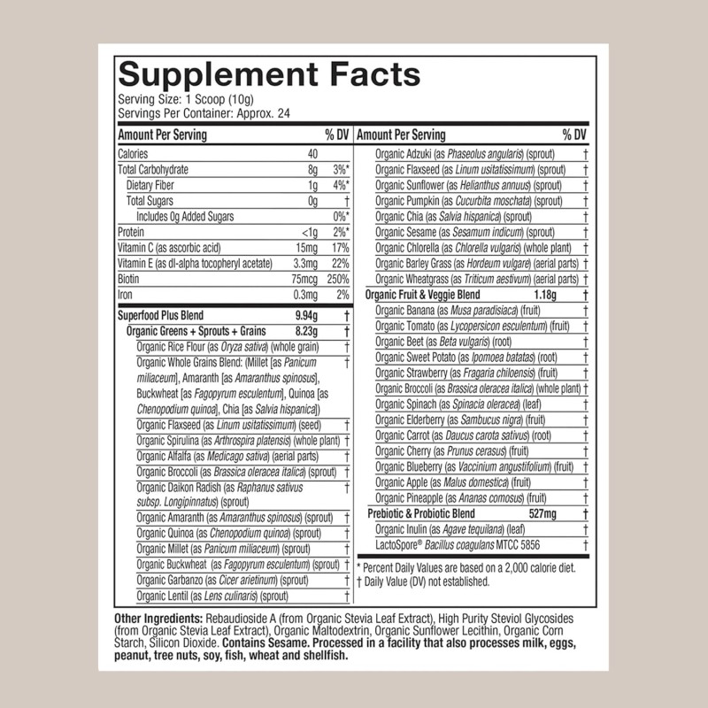 Sans arômes, colorants ou édulcorants artificiels : Purely Inspired Organic Greens est une formule propre et fiable. Certifiée biologique USDA, sans gluten, non-OGM, végane et sans soja.