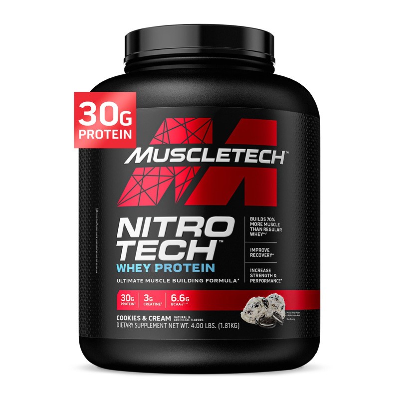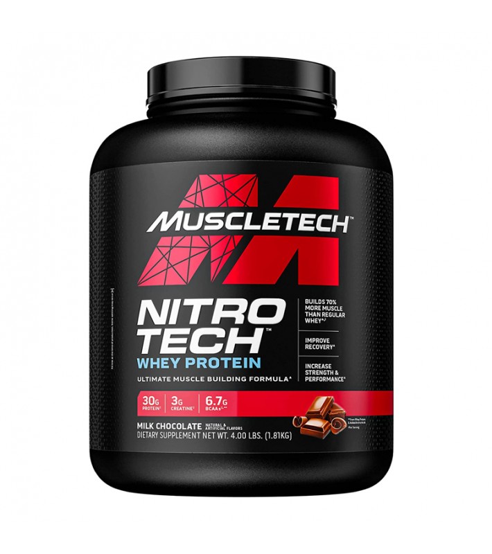 Nitrotech whey protein est une formule de protéine améliorée, conçue scientifiquement pour tous les athlètes à la recherche de plus de muscle, de force et de meilleures performances avec des sources de protéines propres, pures, et facilement digérées. Chaque cuillère de Nitro-Tech contient 30 grammes de protéines, principalement des isolats de protéines de lactosérum et des peptides de lactosérum. Une forme filtrée pour vous apporter une whey de meilleure qualité. Grace à ce produit, votre corps peut facilement assimiler les acides aminés de la protéine pour construire un muscle vraiment impressionnant. Cela fait de Nitro-Tech un choix idéal en tant que protéine post-entraînement pour stimuler la synthèse des protéines musculaires à tout moment de la journée. Nitro-Tech a été filtrée à laide de la technologie de filtration multiphase pour réduire la quantité de matière grasse, de lactose et d'impuretés par rapport aux sources de protéines moins chères. Il est également riche en glucide avec 10 grammes par dose