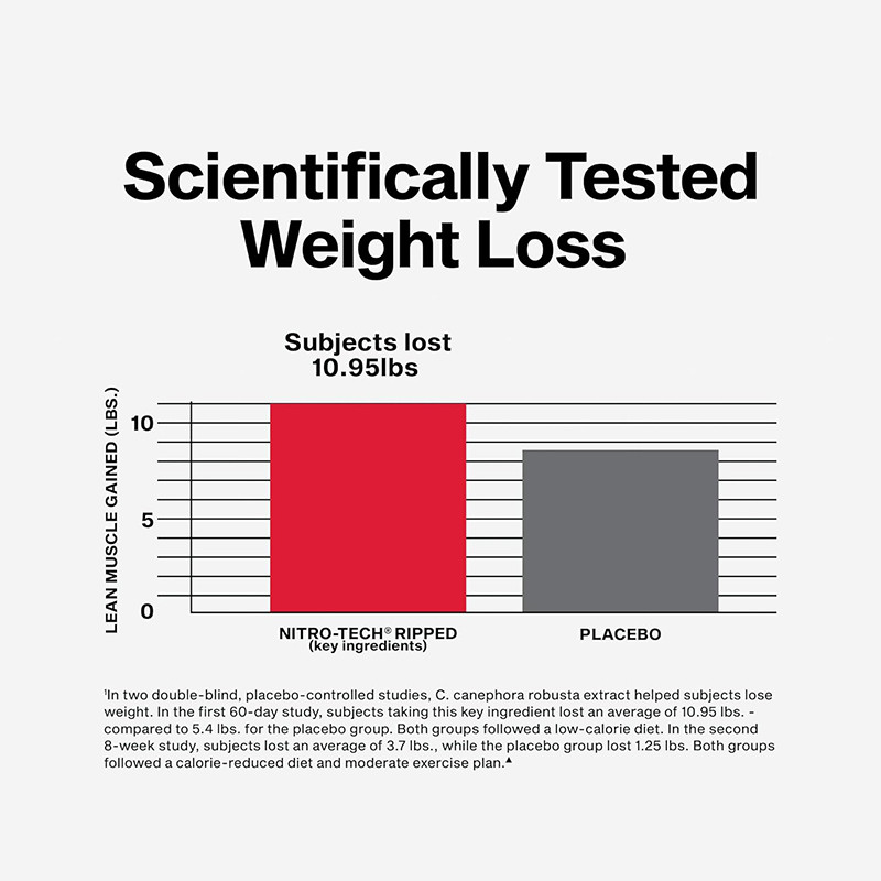 MuscleTech a conçu Nitro-Tech Ripped pour vous apporter des protéines de lactosérum ultra-pures afin d'aboutir à des résultats réels sur la perte de poids à partir d'un régime hyperprotéiné et basses calories. Il s'agit d'une protéine différente de ce que vous avez vu auparavant. Contrairement à la concurrence, chaque dosette de Nitro-Tech Ripped contient une dose scientifiquement étudiée d'un ingrédient clé, le Coffea canephora robusta !Nitro-Tech Ripped fournit d'abord un mélange de 30grammes de peptides et d'un isolat de lactosérum pour la digestibilité, avec un taux élevé d'acides aminés essentiels à chaîne branchée (BCAA). Cependant, les chercheurs de MuscleTech ne s'arrêtent pas là-bas, car chaque portion de cette nouvelle formule de protéines 7 en 1 fournit également du CLA, MCT, L-Carnitine tartrate, extrait de thé vert, extrait de fruits de l'églantier, poudre de varech (algue marine) et du Coffea canephora robusta pour les régimes orientés vers la perte de poids et la définition musculaire !