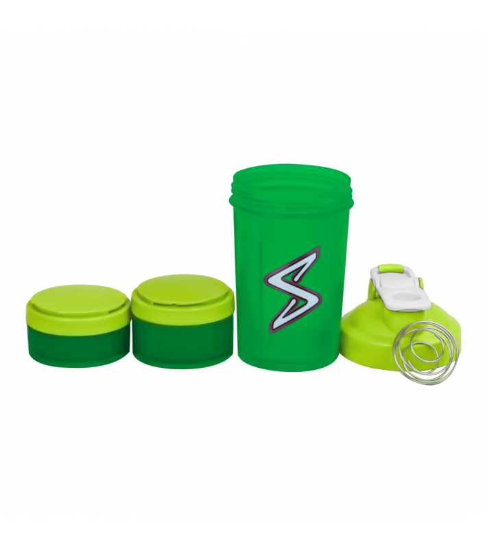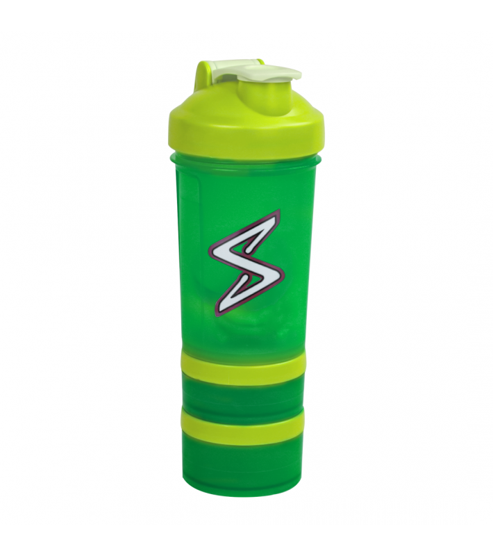 Le shaker squeeze au design unique, léger pratique à transporter. Il est conçu pour mélanger vos protéines de Whey (ou autre) avec le liquide de votre choix, que ce soit du lait de l'eau ou des jus (à vous d'essayer!). Il contient aussi 2 compartiments à sa base pour y stocker des produits tels que des comprimés, des gellules ou des poudres.